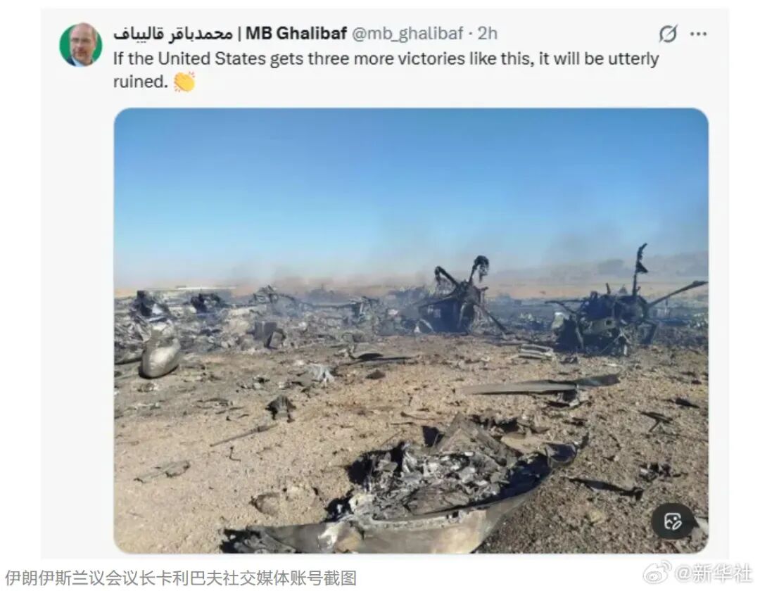 伊朗伊斯兰议会议长卡利巴夫5日在社交媒体发布一张飞机残骸照片并评论称,如果美国再取得这样的“胜利”,就将“彻底被毁灭”。