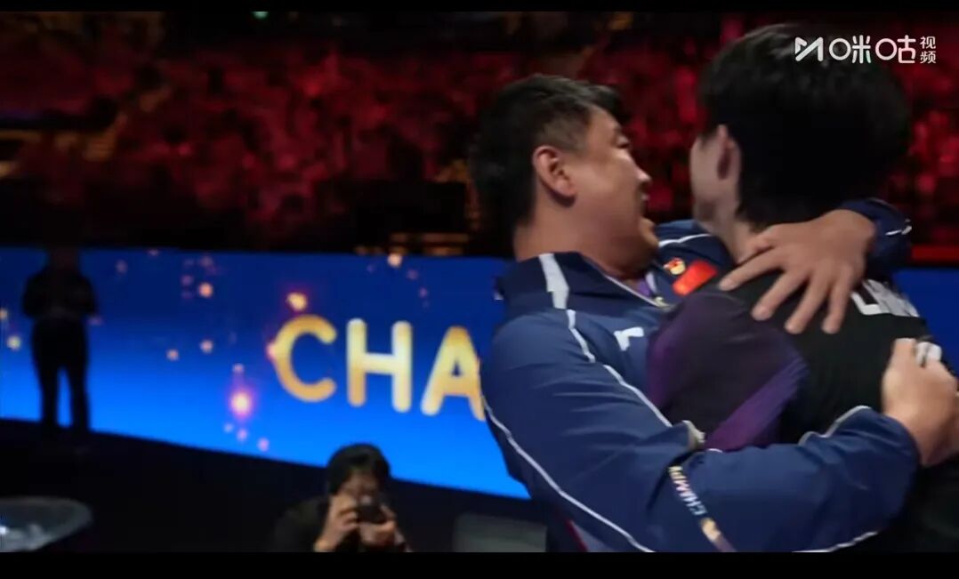 赛后,王楚钦大吼庆祝胜利,和王皓指导深情相拥。