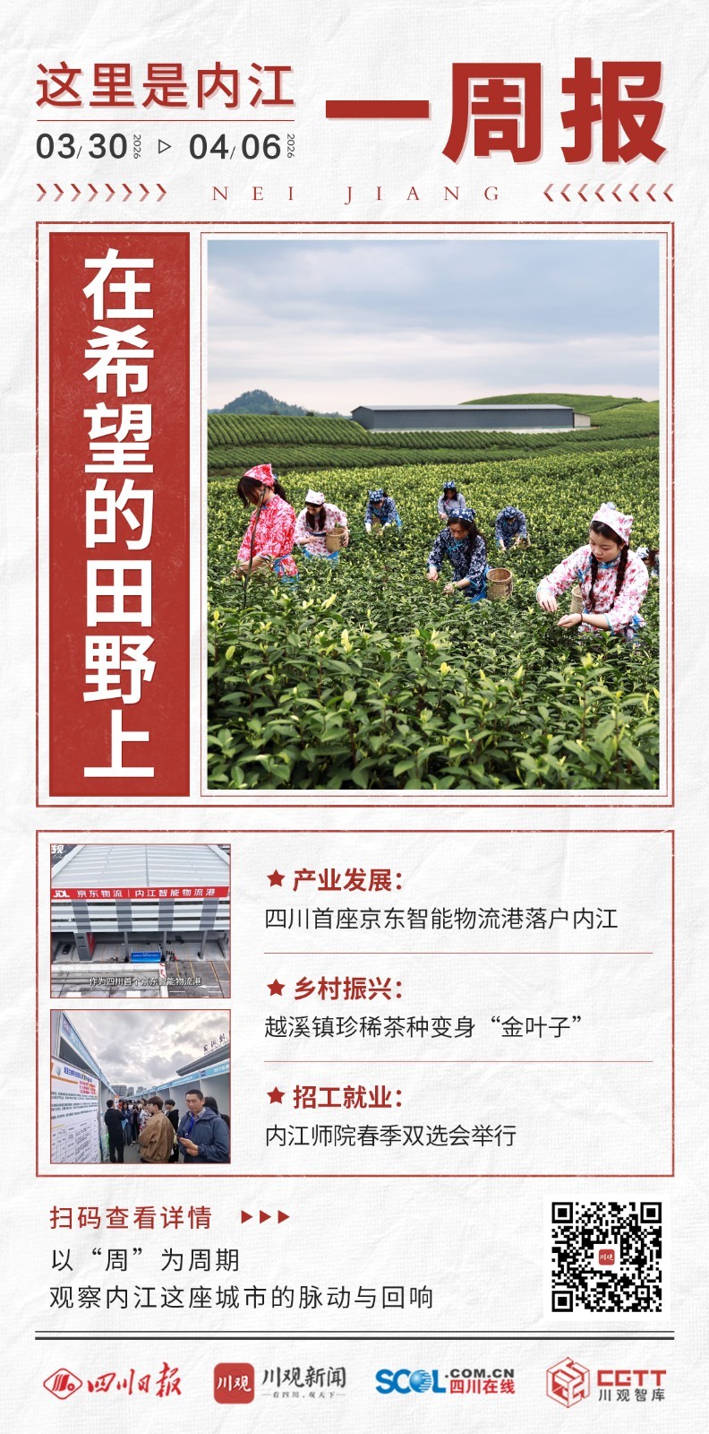这一周,四川首座京东智能物流港落户内江,该项目将实现从单一仓库租赁到全供应链运营的业态升级,彻底改写内江传统物流粗放运营的模式,带来了内江物流产业跨越发展的希望;这一周,威远县越溪镇“镇”了不起主题发布会在青宁村举行,深山好茶走进千家万户,带来了农民增收致富的希望;这一周,“智汇天府 兴业内江”公共招聘进校园活动暨内江师范学院2026届毕业生春季双选会举行,带来了大学生们开启人生新阶段的希望。