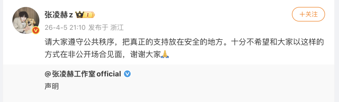 4月5日晚,@张凌赫工作室official 发声明抵制私生: