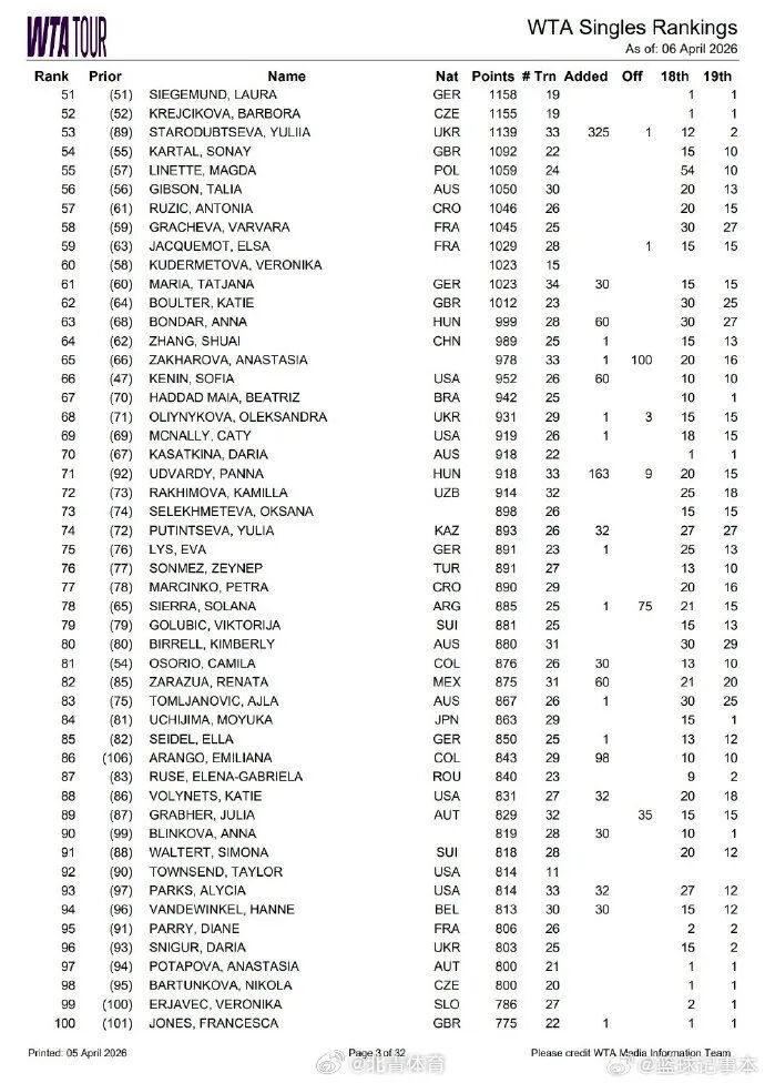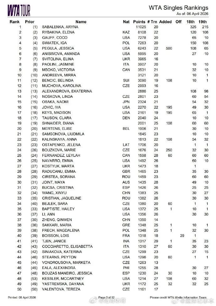 据@北青体育 4月6日消息,WTA最新排名(4.6):郑钦文从第30位下滑至第37位。王欣瑜上升2位,位列第32。张帅下滑2位,位列第64。