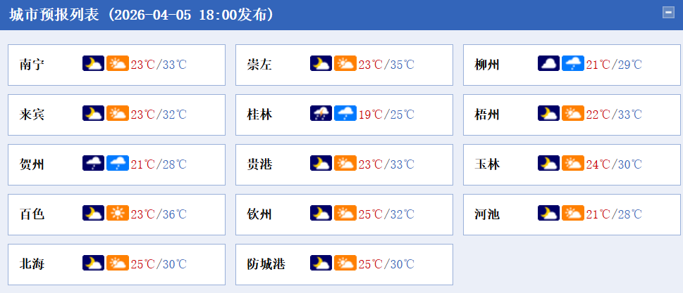 广西气象台预计,6日晚上到7日白天:桂北部分地区有阵雨或雷雨、局地中雨,其他地区多云、局地阵雨。左右江河谷最高气温34~35℃、局地36℃以上。7日晚上到8日白天:全区多云到晴,其中桂北局地有雷阵雨。桂西部分地区最高气温35~36℃、局地37℃以上。桂西、桂南部分地区午后有偏南风5级、阵风6~7级。(详情>>)