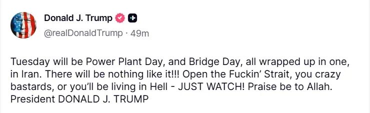 特朗普在社交媒体上发文说,“4月7日将是伊朗的发电厂日和大桥日”,暗示要猛烈轰炸伊朗的发电厂和大桥。他还说:“打开那个该死的海峡,否则你们将活在地狱中——走着瞧!” 特朗普甚至在帖文中爆出粗口,言语间情绪十分激动。(详情>>)