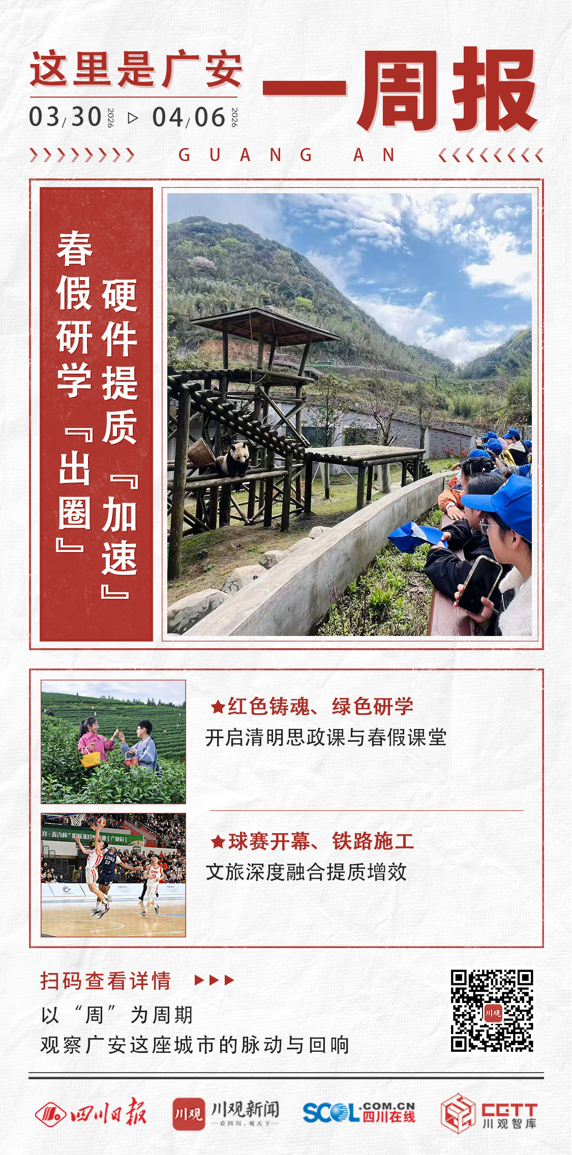 本周(3月30日至4月6号),过去一周,广安用两种颜色标注春日刻度:红色是英烈精神在思政课上薪火相传,绿色是中小学生踏青采茶、探访熊猫的研学脚步。与此同时,国际篮球对抗赛在广安奥体中心开幕,南充至广安铁路施工中标落定,把城市发展动能一并写入春天。