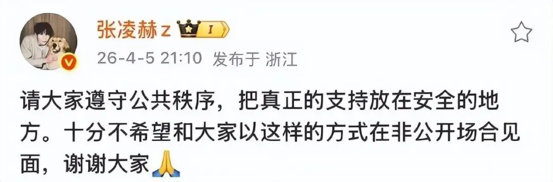 随后,张凌赫转发工作室博文,并称,“请大家遵守公共秩序,把真正的支持放在安全的地方。十分不希望和大家以这样的方式在非公开场合见面。”