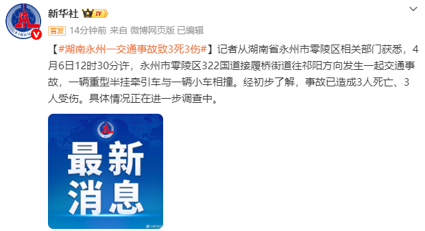 据新华社,记者从湖南省永州市零陵区相关部门获悉,4月6日12时30分许,永州市零陵区322国道接履桥街道往祁阳方向发生一起交通事故,一辆重型半挂牵引车与一辆小车相撞。