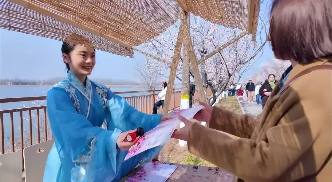 走进生态岛,绿草鲜花,碧波荡漾,身着华美汉服的花神缓步巡游,衣袂翩跹,所到之处游客纷纷驻足拍照,快门声此起彼伏。游客中心前,领取“赏花护照”的游客排起长队。大家手持“护照”穿梭于岛内各点位,认真寻找花神印章,沉浸式感受国风游园的乐趣。