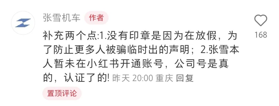 此外,“张雪机车”在评论区补充表示,没有印章是因为在放假,为了防止更多人被骗临时出的声明;张雪本人暂未在小红书开通账号,公司号已认证。