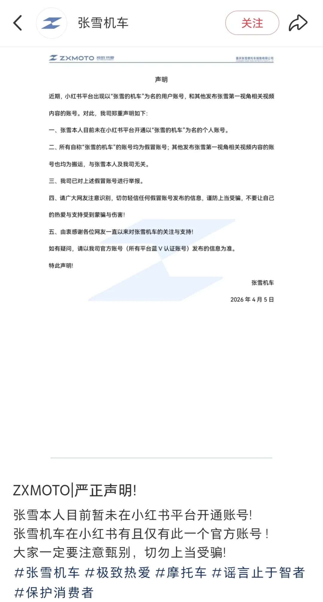 近期,小红书平台出现以“张雪的机车”为名的用户账号,和其他发布张雪第一视角相关视频内容的账号。对此,我司郑重声明如下: