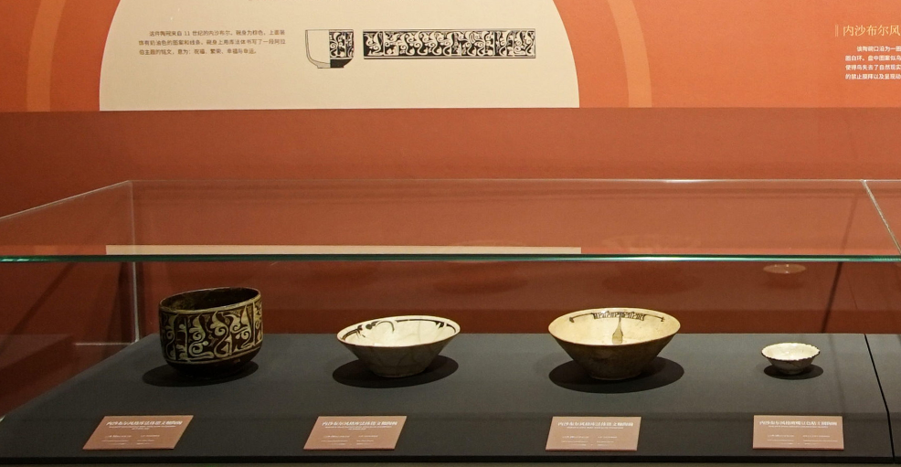 伊利汗国时期(公元1256年-1355年)的一件方形凤凰云纹釉砖对中国观众来说有些眼熟,整个砖面是一只中国风的凤凰,四周是中国常见的云纹和波浪纹,明显可见中国元素在伊朗的影响力。公元7-8世纪,中国白瓷进入伊朗市场并广受好评,伊朗陶匠开始仿制中国白瓷,通过刷裹本地的化妆土再烧制,形成独特的“内沙布尔风格”陶器。