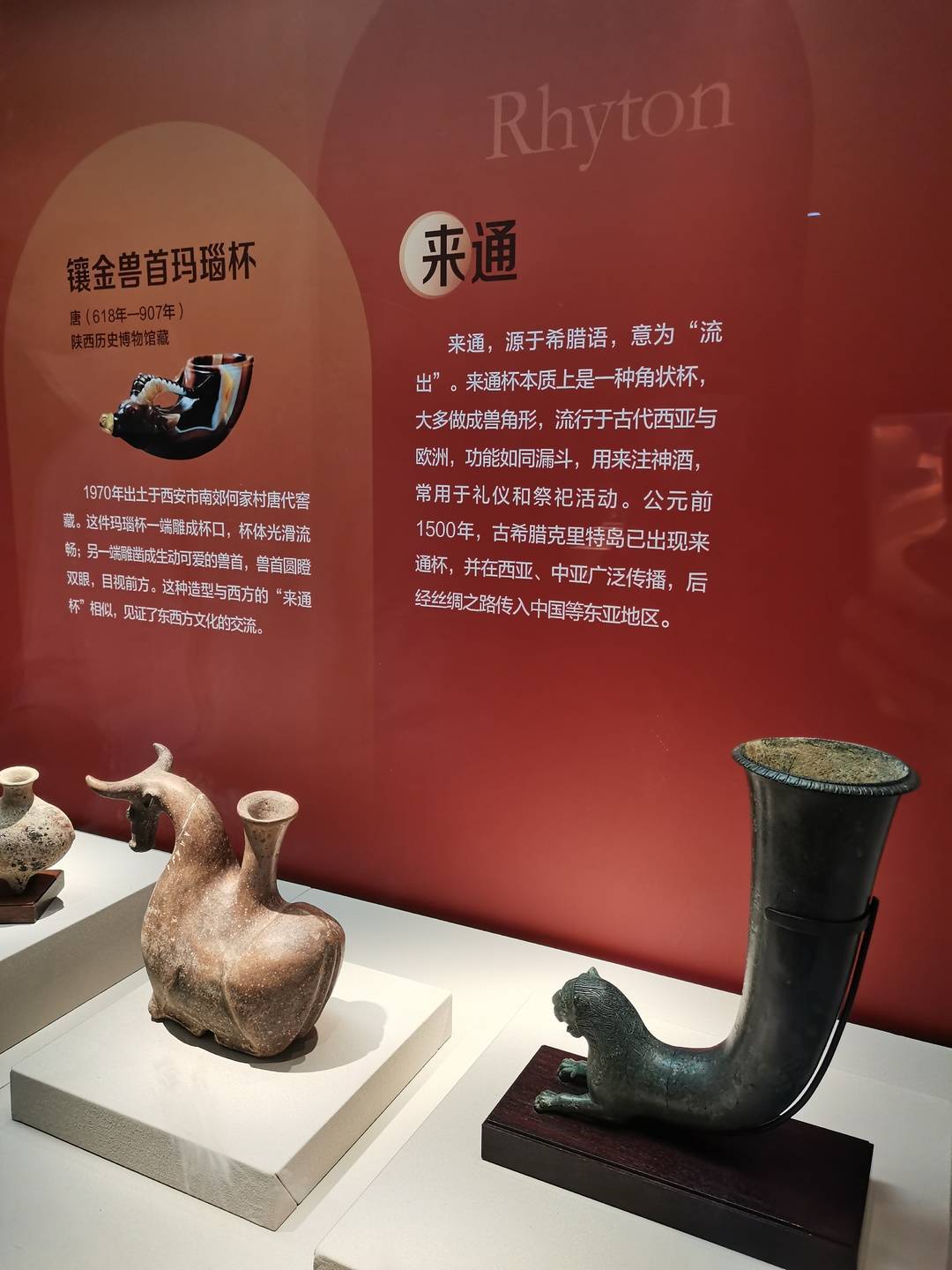 “来通”(Rhyton)一词源自古希腊语,意为“流动”或“流出”。在宗教仪式、宴会庆典等重要场合,来通常作为酒器使用。大约在公元3-4世纪,来通传入中国,在中国唐代较为流行,如陕西西安何家村出土的唐代兽首玛瑙杯、四川大学博物馆收藏的唐代邛窑胡人抱角杯等,都是来通杯中的精品。
