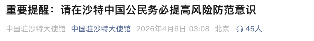 今天(6日)凌晨,中国驻沙特大使馆发布重要提醒:请在沙特中国公民务必提高风险防范意识。