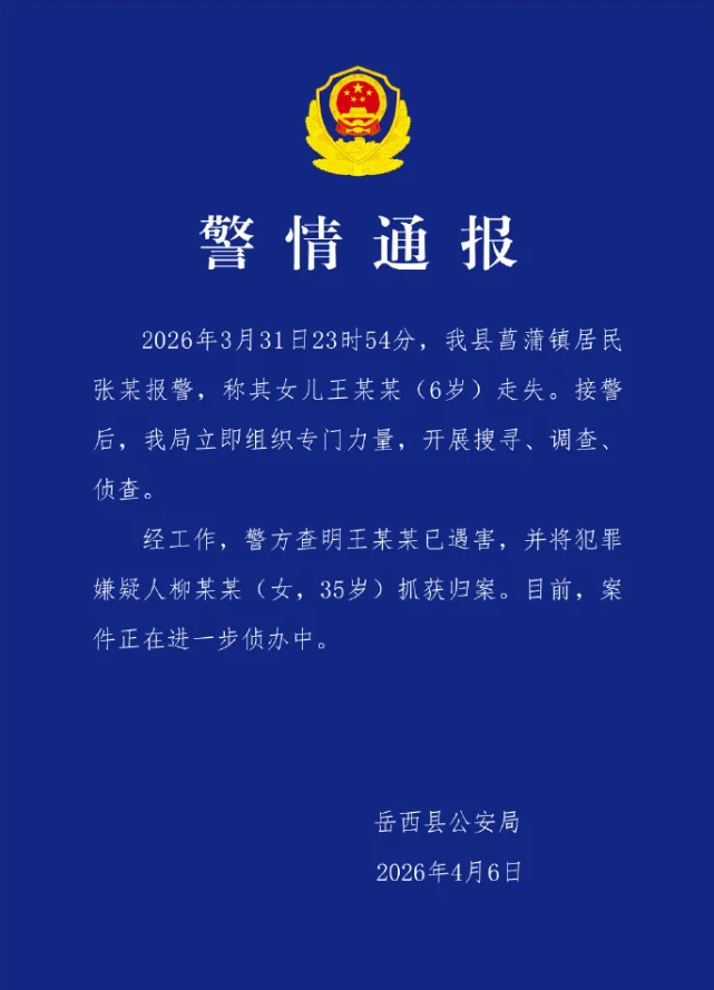 4月6日,“岳西公安”公众号发布“安徽6岁失联女孩”的情况通报,全文如下: