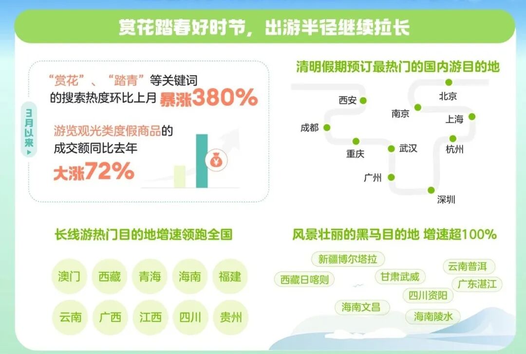 清明旅游热度已形成“涟漪效应”,数据显示,“五一”假期(4月30日至5月4日)旅游产品搜索热度在清明期间环比提升超320%,预示“五一”旅游市场有望延续繁荣态势。