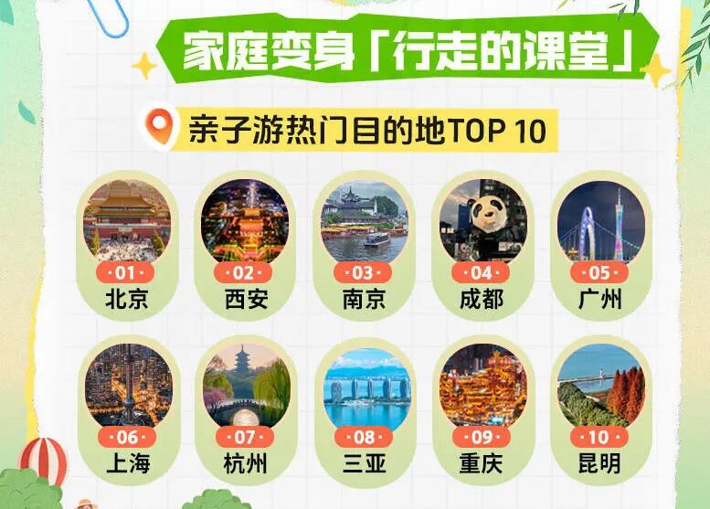 6天小长假延伸了家庭出游半径,亲子长线游订单同比翻倍;度假订单中亲子人群占比达四成,同比增长近20个百分点。北京、西安、南京、成都等拥有优质文博资源的城市成为热门研学目的地,南京、成都等城市同时作为客源地和目的地,呈现双向繁荣态势。