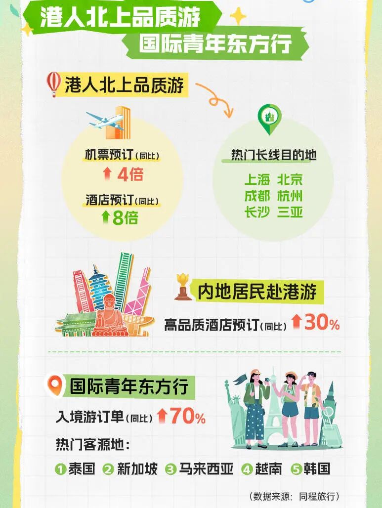 假期也推动出行半径向更广范围延伸。同程旗下国际平台HopeGoo数据显示,港人赴内地机票预订量同比激增近4倍,酒店预订量同比增幅达8倍;大湾区“一小时生活圈”催生高频短途游,上海、北京、成都等城市则成为长线热门选择。此外,入境游订单同比增长超70%,入境游客多为泰国、新加坡、马来西亚、越南、韩国等亚洲国家及欧美国家的青年,旅行方式接近短期游学,标志着入境游从“风景消费”向“知识与文化消费”升级。