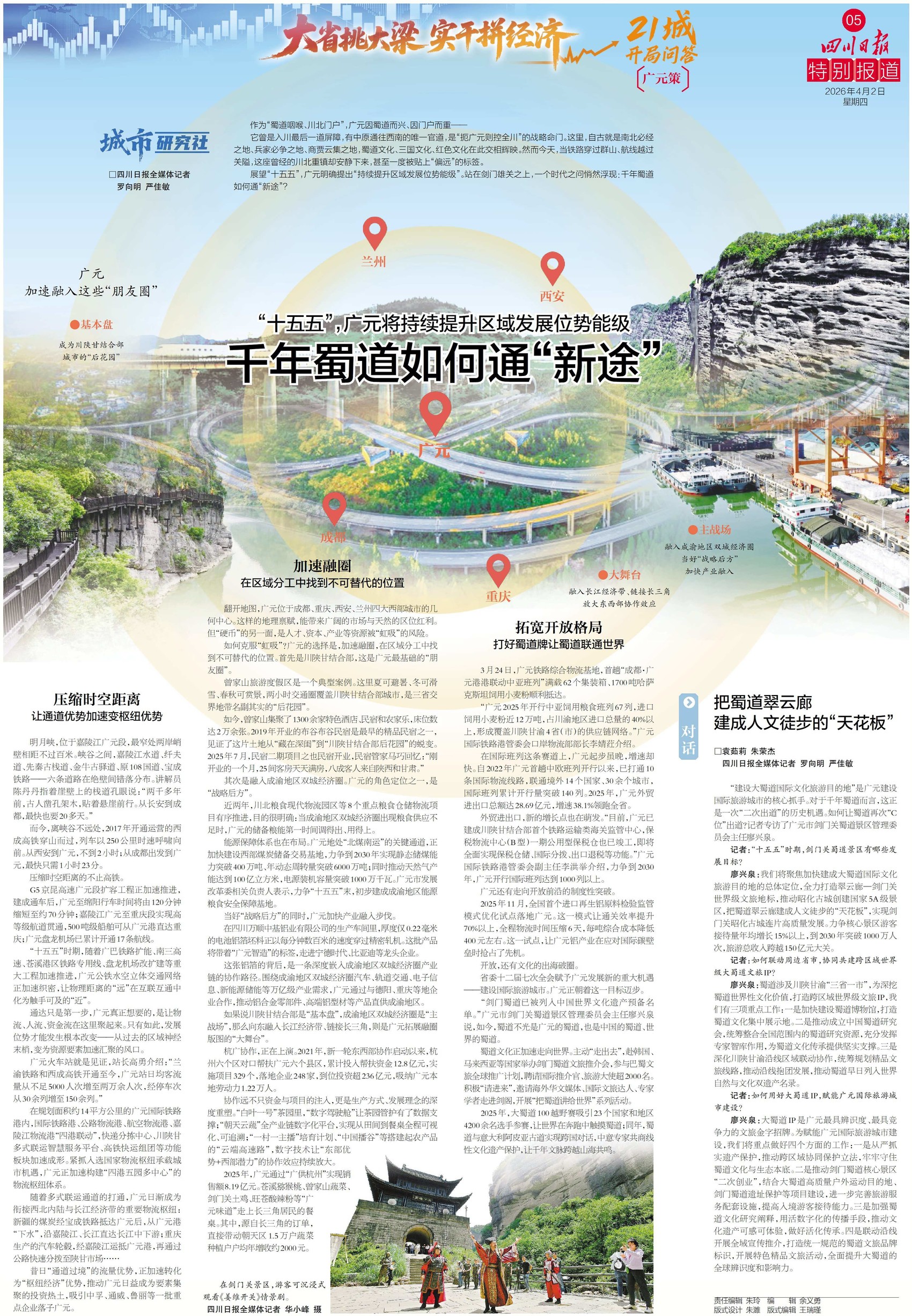4月2日,《四川日报》整版刊发《千年蜀道如何通“新途”》,聚焦作为“蜀道咽喉、川北门户”的广元,在历经历史烟云与世事变迁之后,如何于新时代找到通向未来的发展道路。