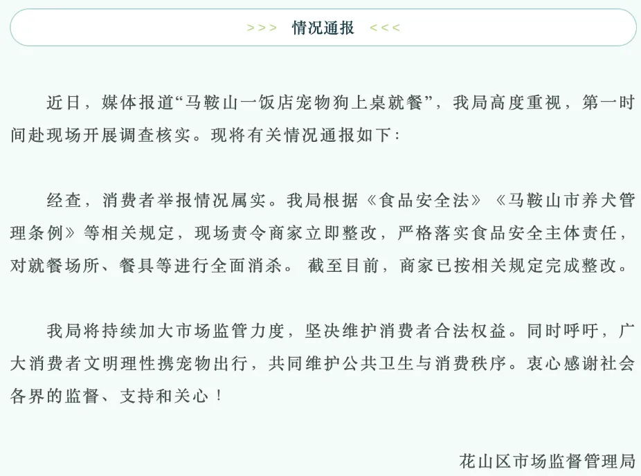 4月6日,安徽马鞍山花山区市场监督管理局发布情况通报:近日,媒体报道“马鞍山一饭店宠物狗上桌就餐”,我局高度重视,第一时间赴现场开展调查核实。现将有关情况通报如下: