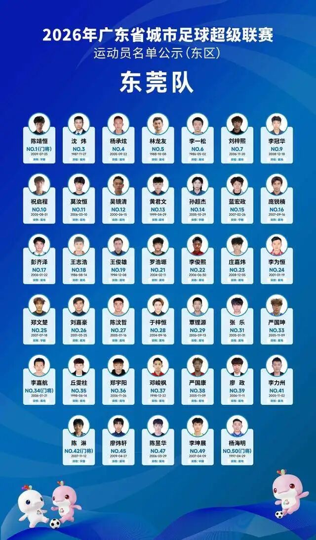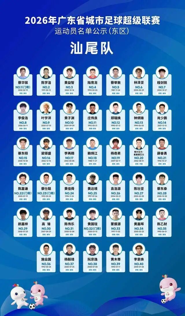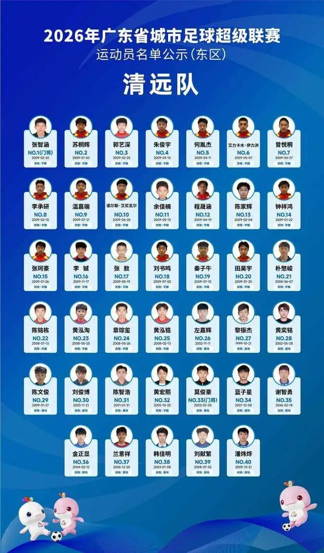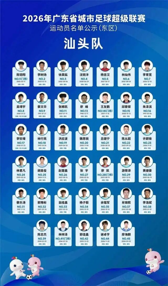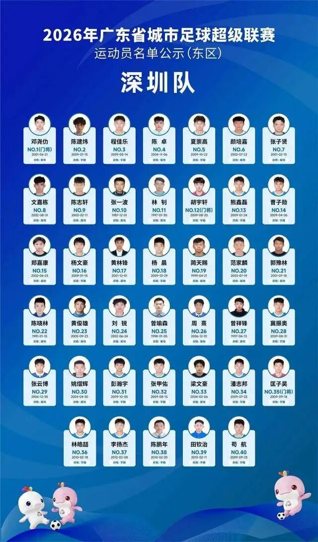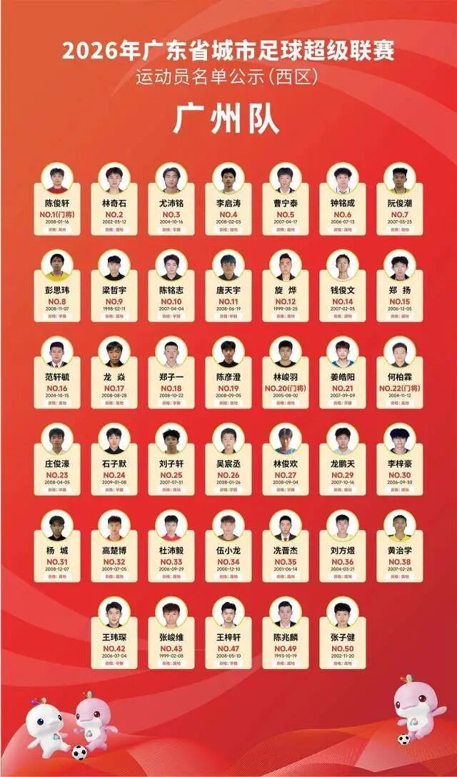 4月5日晚,广东省足球协会正式公示2026年广东省城市足球超级联赛(粤超联赛)21支城市队伍的参赛运动员名单,公示期为4月5日至4月8日17时。其中,广州队以40人阵容亮相,球队以2006—2008年龄段球员为核心,兼顾老中青三代球员配置,正式开启新赛季粤超的备战征程。