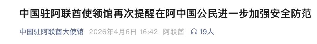 今天(6日),中国驻阿联酋大使馆发布通知,再次提醒在阿中国公民进一步加强安全防范,全文如下: