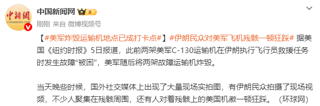 据美国《纽约时报》5日报道,此前两架美军C-130运输机在伊朗执行飞行员救援任务时发生故障“被困”,美军随后将两架故障运输机炸毁。