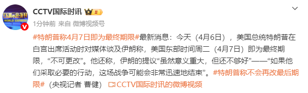 今天(4月6日),美国总统特朗普在白宫出席活动时对媒体谈及伊朗称,美国东部时间周二(4月7日)即为最终期限,“不可更改”。他还称,伊朗的提议“虽然意义重大,但还不够好”——“如果他们采取必要的行动,这场战争可能会非常迅速地结束”。
