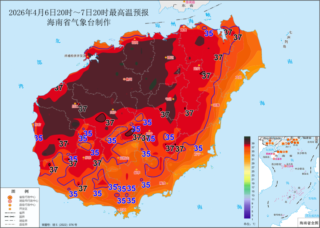 海南省气象局2026年04月06日16时20分继续发布高温四级预警:预计4月7日白天,海口、澄迈、临高、定安、屯昌、儋州、白沙、昌江和东方等9个市县的大部分乡镇将出现37摄氏度以上的高温天气,请有关单位做好防暑降温、森林防灭火等相关工作。