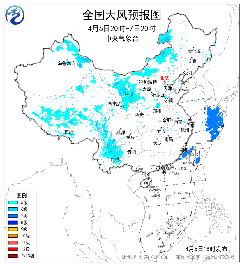 ■ 中央气象台6日发布大风蓝色预警:6日20时至7日20时,新疆北部、内蒙古、甘肃东部、宁夏、陕西北部以及西藏、川西高原、云南等地部分地区有5至7级风,阵风7至9级;东海东部海域、台湾海峡、台湾以东洋面将有7级、阵风8级的风。