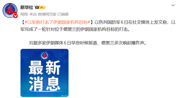 以色列国防军6日在社交媒体上发文称,以军完成了一轮针对位于德黑兰的伊朗国家机构目标的打击。