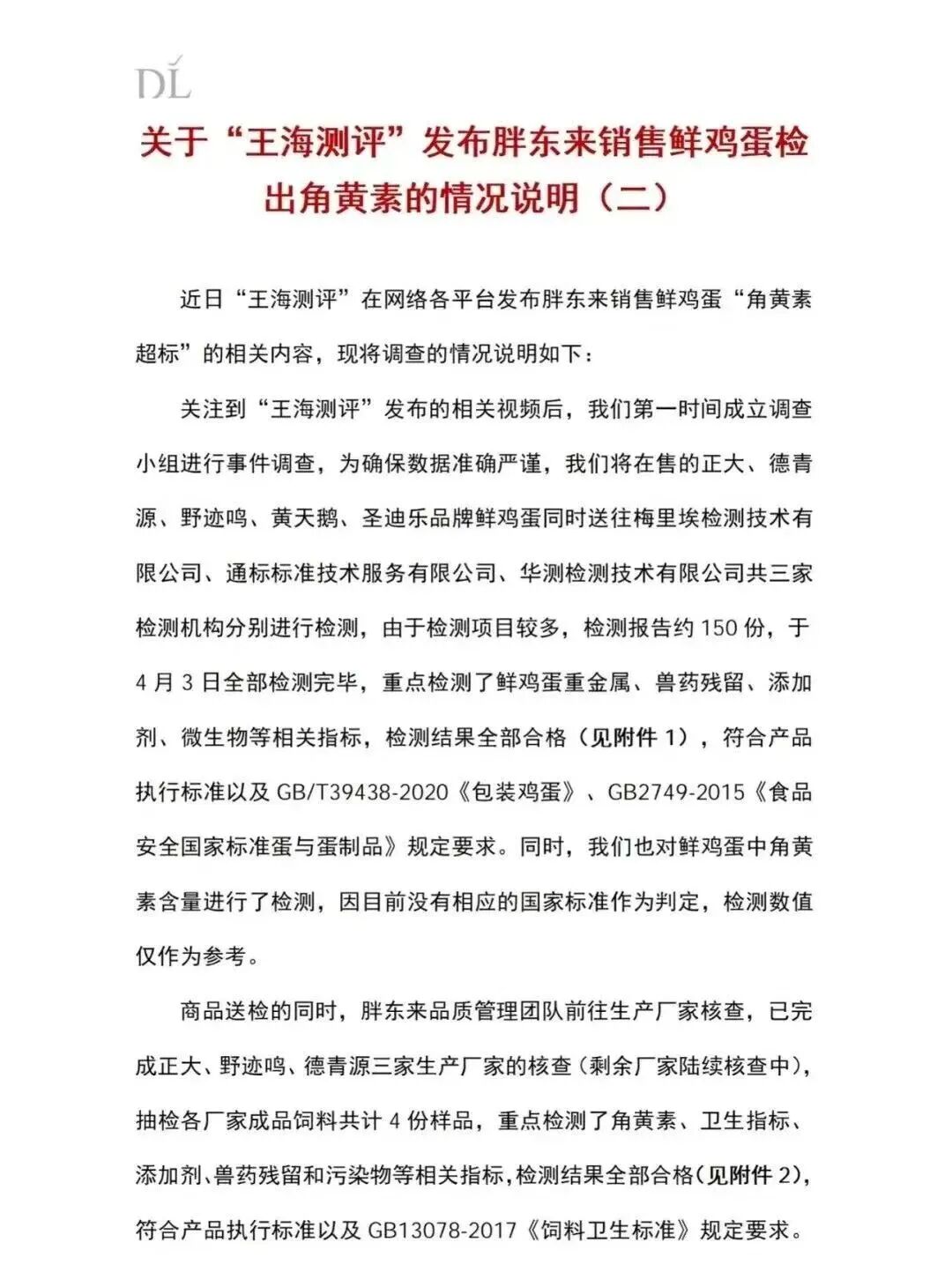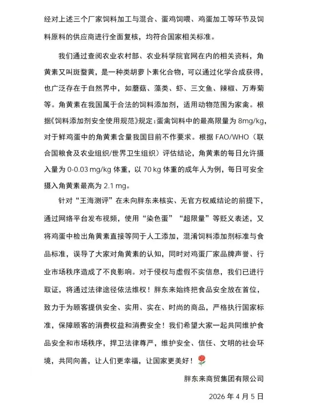 4月5日,胖东来官方账号发布关于“王海测评”发布胖东来销售鲜鸡蛋检出角黄素的情况说明(二)。