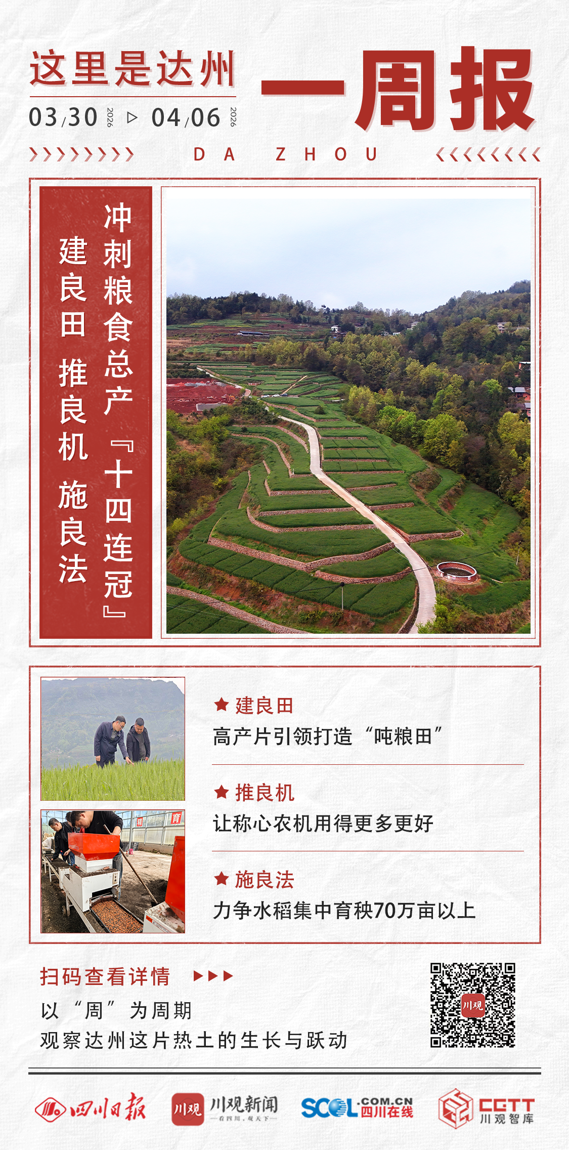 达州粮食总产量已经连续13年位居全省第一,今年初锁定了夺取“十四连冠”的目标。如何稳产增产?近期,当地着重抓好春耕重点,不误农时起跑冲刺。
