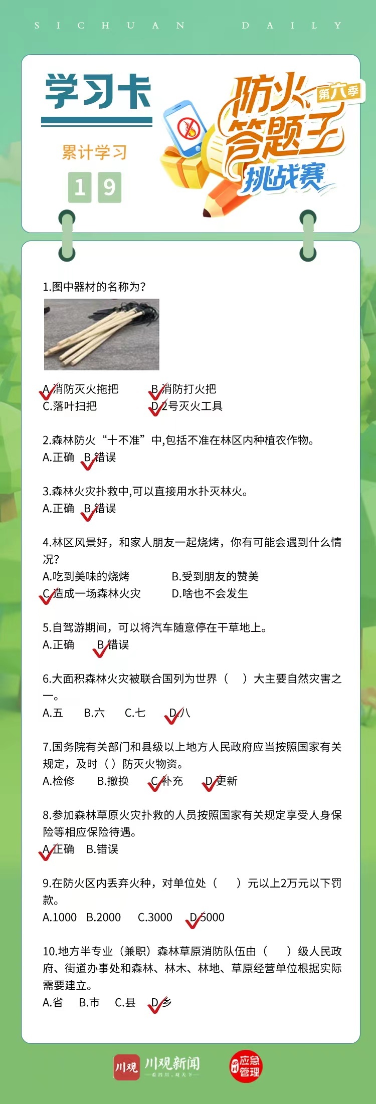 森林防火,警钟长鸣!春季林区风景好,和家人朋友一起烧烤,你可能会遇到什么情况?答案是造成一场森林火灾!这种危险行为千万别做,稍有不慎就会引发森林火灾!大面积森林火灾被联合国列为世界八大主要自然灾害之一。划重点!县级以上政府需及时补充防灭火物资,扑救人员按规定享人身保险等相应保险待遇;自驾游期间,汽车不能停在干草地上。森林防火知识点记心间,争做防火“答题王”!