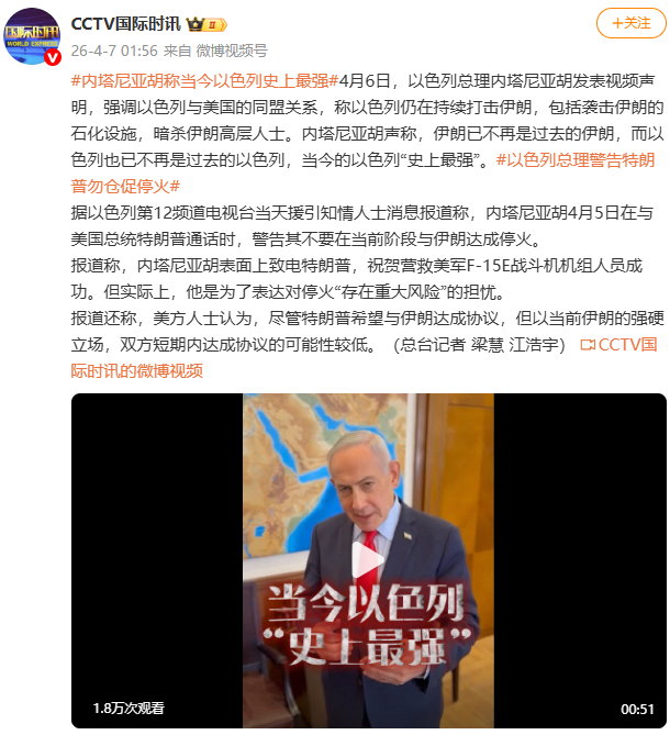 4月6日,以色列总理内塔尼亚胡发表视频声明,强调以色列与美国的同盟关系,称以色列仍在持续打击伊朗,包括袭击伊朗的石化设施,暗杀伊朗高层人士。内塔尼亚胡声称,伊朗已不再是过去的伊朗,而以色列也已不再是过去的以色列,当今的以色列“史上最强”。