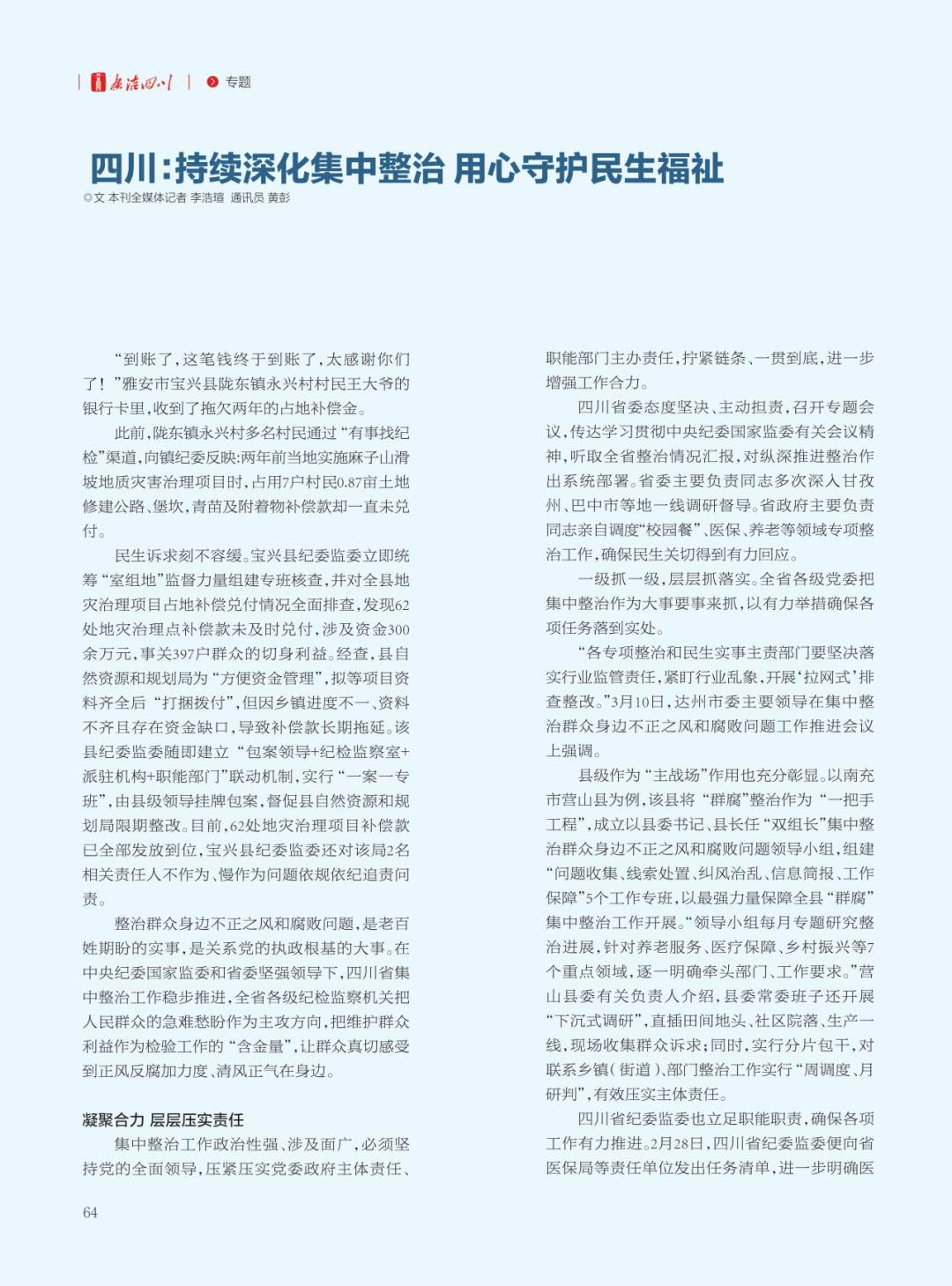 整治群众身边不正之风和腐败问题,是老百姓期盼的实事,是关系党的执政根基的大事。在中央纪委国家监委和省委坚强领导下,四川省集中整治工作稳步推进,全省各级纪检监察机关把人民群众的急难愁盼作为主攻方向,把维护群众利益作为检验工作的“含金量”,让群众真切感受到正风反腐加力度、清风正气在身边。