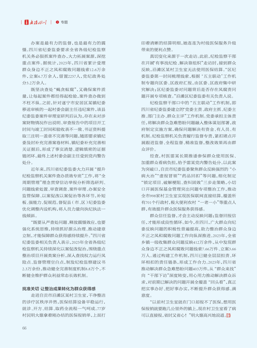 群众信任监督,才会主动反映问题;监督回报信任,才能形成良性循环。如今,在四川,广大群众向纪委反映问题的积极性普遍提高,助力整治群众身边不正之风和腐败问题工作向纵深推进。2025年,全省乡镇一级收集群众问题反映412万余件,从中发现群众身边不正之风和腐败问题线索7.66万件、立案3.66万人。通过构建工作机制,四川已健全层层担责、环环相扣的责任链条,形成工作合力。2025年,四川省推动解决群众急难愁盼问题403万件,从“群众来找”向“干部下访”深度转变,用心用力推动解决群众诉求,对前期已解决的问题开展全覆盖“回头看”,真正把实事办好、把好事办实,不断提升群众获得感、满意度。
