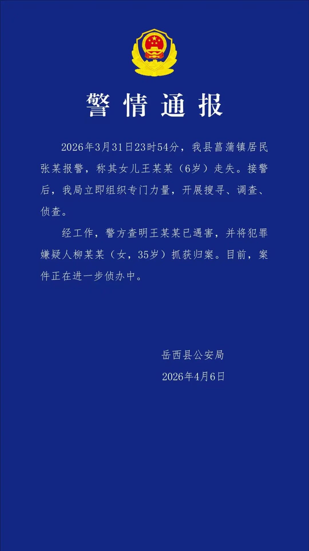 4月6日,安徽岳西县公安局就“安徽6岁女童失联”发布《警情通报》:该女童已遇害,犯罪嫌疑人柳某某已被抓获归案。(此前报道:安徽6岁女童家门口失联超5天!村民讲述细节→)