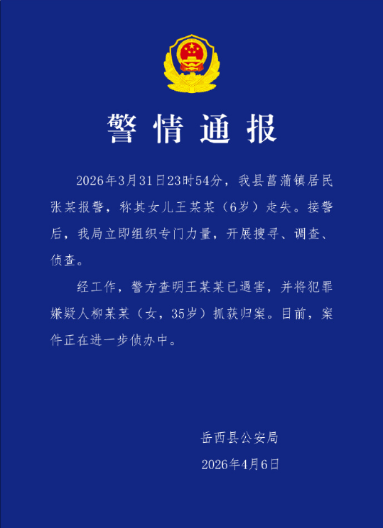 2026年3月31日23时54分,我县菖蒲镇居民张某报警,称其女儿王某某(6岁)走失。接警后,我局立即组织专门力量,开展搜寻、调查、侦查。