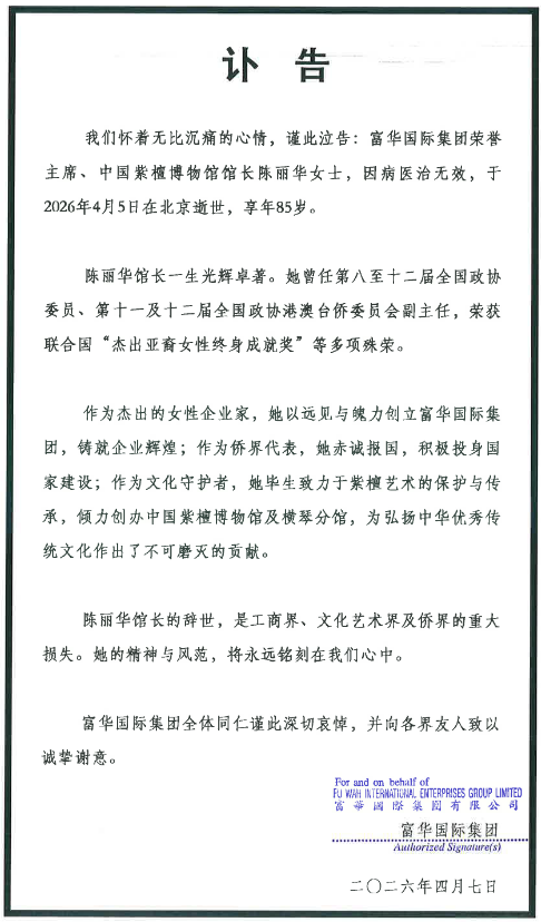 富华国际集团4月7日发布讣告:富华国际集团荣誉主席、中国紫檀博物馆馆长陈丽华女士,因病医治无效,于2026年4月5日在北京逝世,享年85岁。