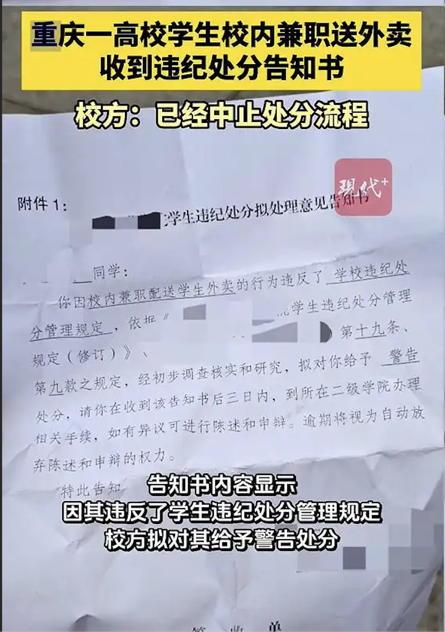 近日,重庆工信职业学院一名学生称,自己兼职送校内外卖,结果收到学校发来的违纪处分告知书,告知其违反了学校的相关规定。3月26日,记者从涉事学校了解到,目前该处分流程已经中止,并没有实际对该学生作出处罚。