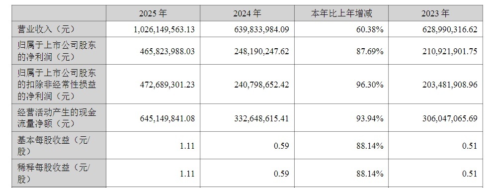 2025年,四川黄金实现营业收入10.26亿元,首次突破10亿元大关,同比增长60.38%;实现归母净利润4.66亿元,同比增长87.69%;实现扣非净利润4.73亿元,同比增长96.3%。公司拟向全体股东每10股派发现金红利5元(含税),合计派现2.1亿元,占本年度归属于母公司股东净利润的45.08%。