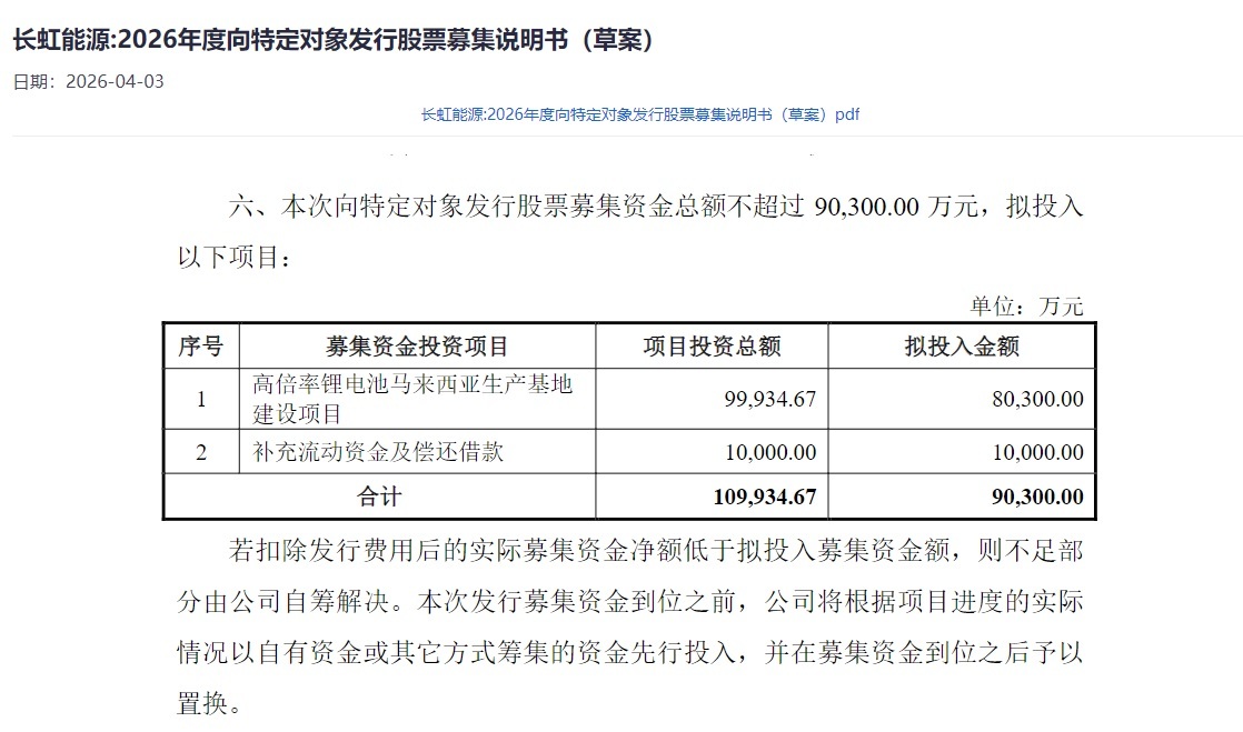 近日,长虹能源(920239)披露公司2026年度向特定对象发行股票募集说明书(草案),拟募资不超过9.03亿元。其中,8.03亿元用于高倍率锂电池马来西亚扩产项目,为发展注入增长动能;另外1亿元募资用于补充流动资金及偿还借款,以优化资产负债结构,提高抗风险能力。