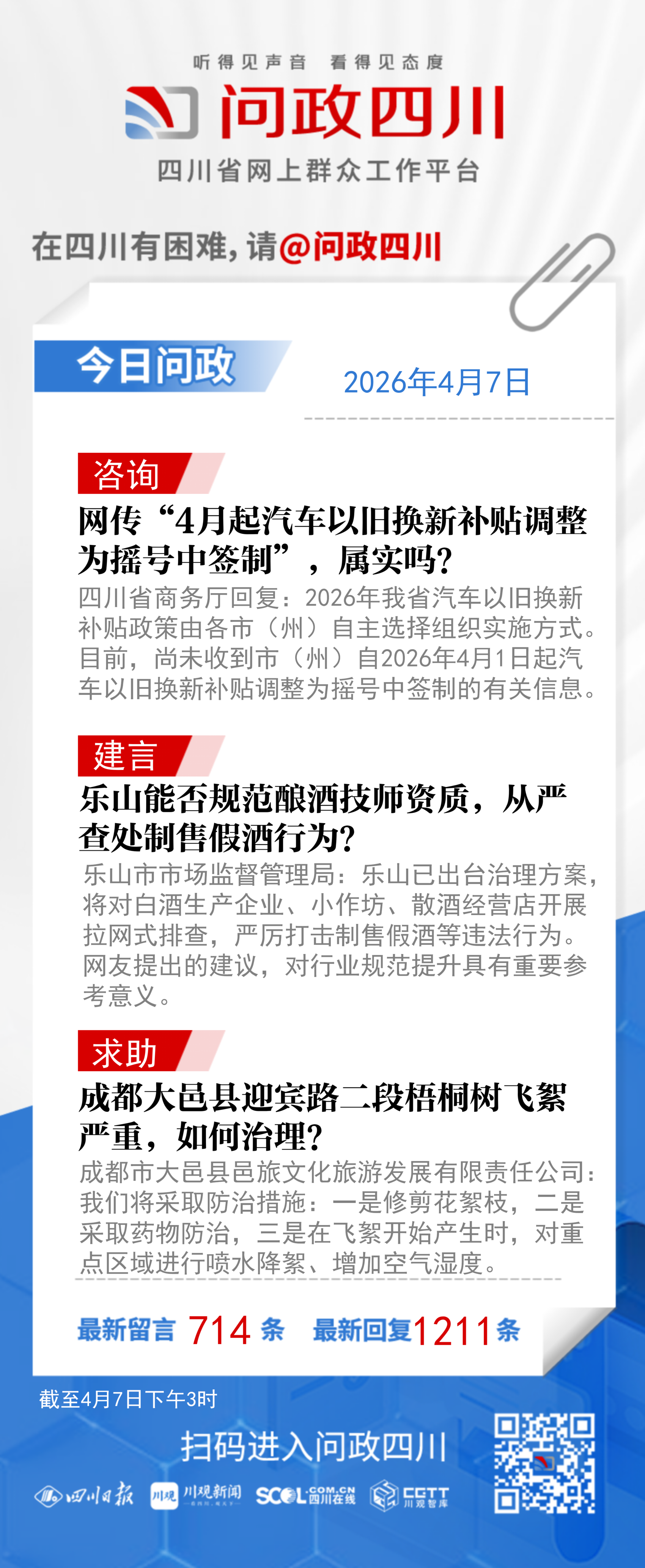 四川省商务厅回复:按照《四川省2026年汽车以旧换新补贴实施细则》有关规定,2026年我省汽车以旧换新补贴政策由各市(州)自主选择组织实施方式,并合理有效把握补贴资金使用的进度和节奏。截至目前,尚未收到市(州)自2026年4月1日起汽车以旧换新补贴调整为摇号中签制的有关信息。