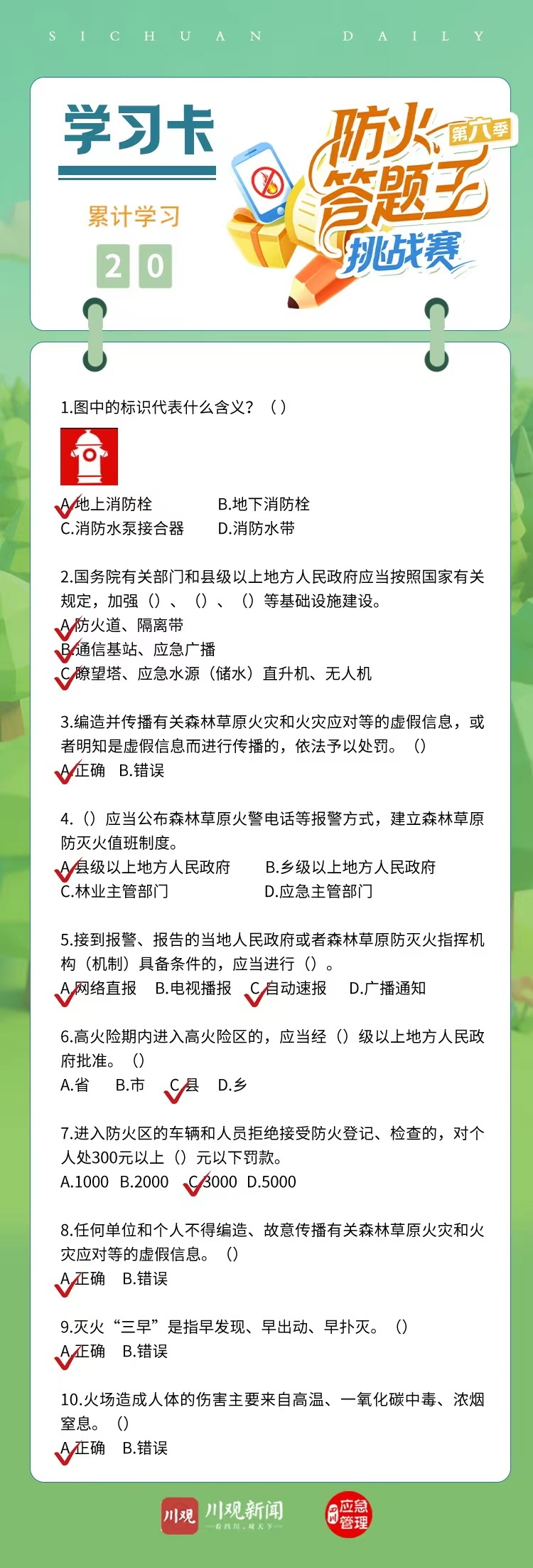 防火“答题王”第六季收官学习卡来啦!今日是答题最后一天,快收下这份安全知识干货!本期重点直击违规处罚红线:进入防火区的车辆、人员若拒不接受防火登记、检查,个人将面临300元以上3000元以下罚款,别因一时疏忽触碰法律红线!编造并传播有关森林草原火灾和火灾应对等的虚假信息,或者明知是虚假信息却进行传播的,依法予以处罚;高火险期内进入高火险区的,应当经县级以上地方人民政府批准;火场造成人体的伤害主要来自高温、一氧化碳中毒、浓烟窒息。最后一天,抓紧答题,将防火知识刻进心间,筑牢安全屏障!