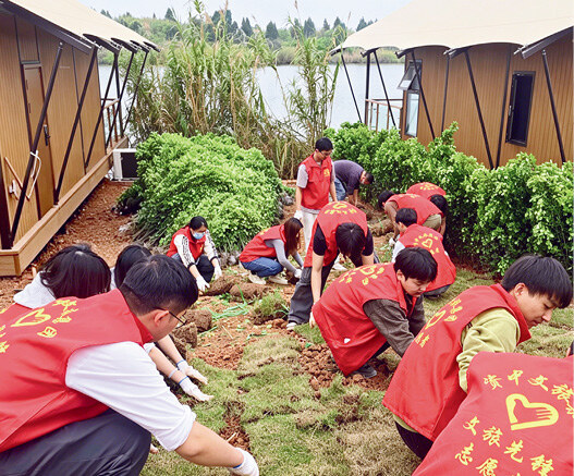 资中龙江湖国际路亚竞钓基地建设现场,资中县属国企青年志愿者正铺设草坪,为景区添绿。供图/资中组