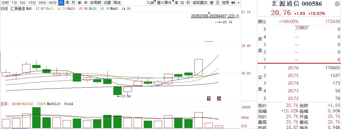 连拉三个涨停板,汇源通信区间累积涨幅达到34.89%,截至4月7日收盘报20.76元,刷新了2017年10月以来的新高。