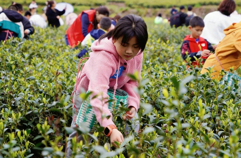 “小小采茶工”们穿梭在茶垄间嫩绿的芽尖在指尖跳跃,竹篓里的茶叶渐渐堆成小山,汗水混着茶香映着孩子们红扑扑的笑脸,累并快乐着,也读懂了“一茶一叶皆辛苦”的深意。