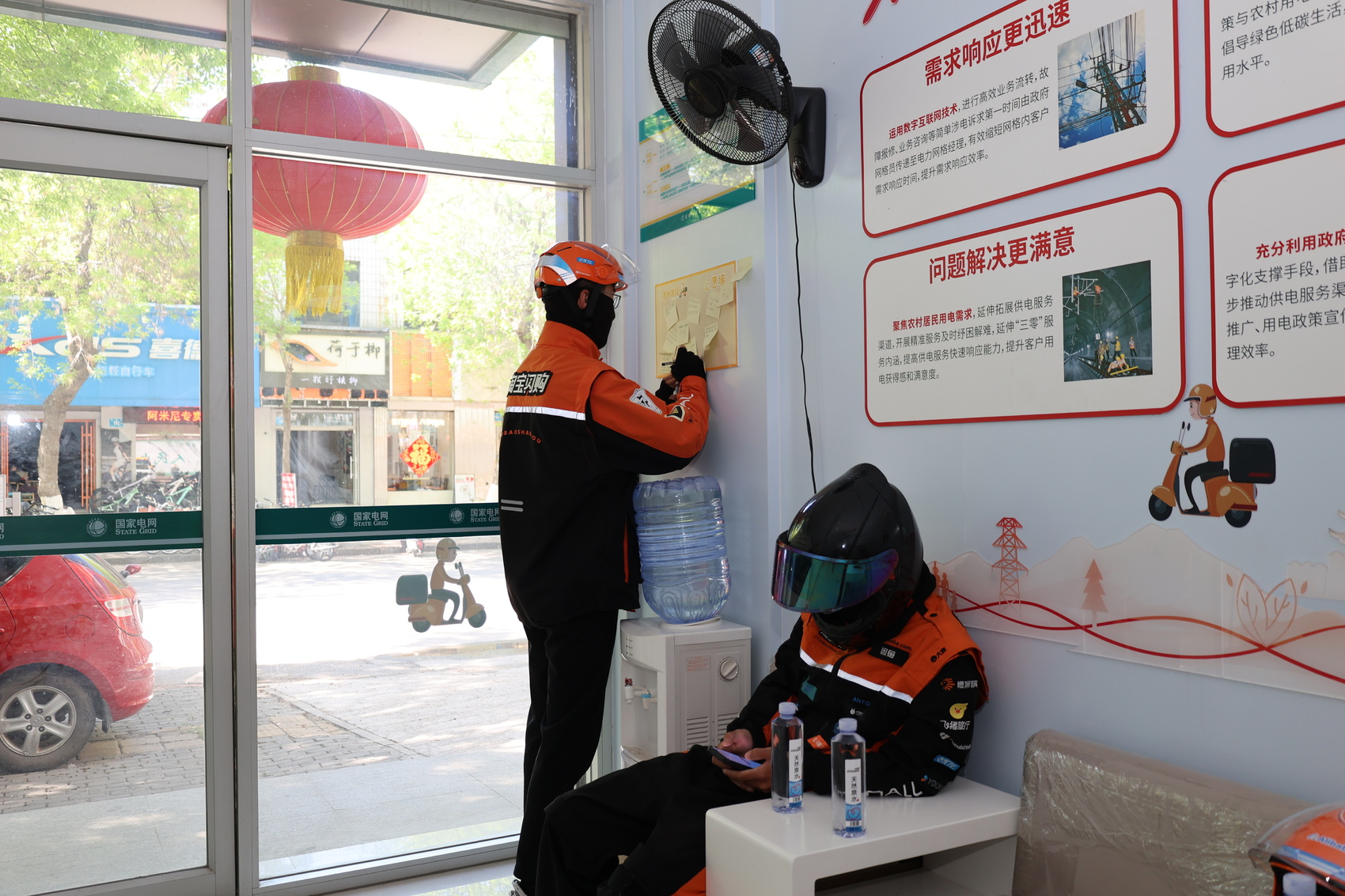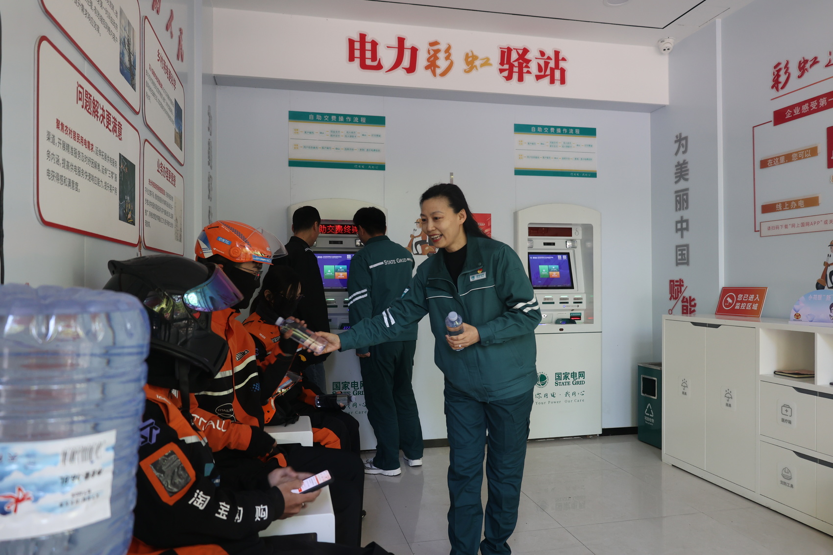 在“电力彩虹驿站”内,国家电网山东电力新时代文明实践志愿者为外卖小哥送水。 国网山东电力供图