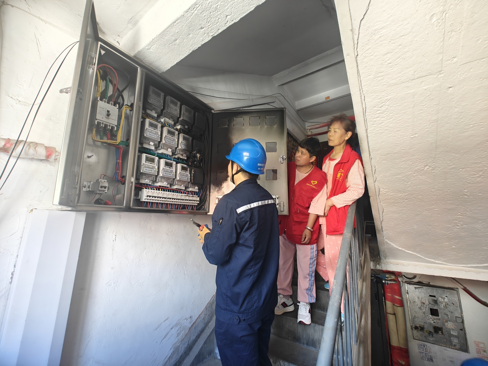国网辽宁电力抚顺供电公司雷锋服务站雷锋共产党员服务队队员与社区文明实践志愿者一同上门为居民检修电力故障。雷锋社区新时代文明实践站供图