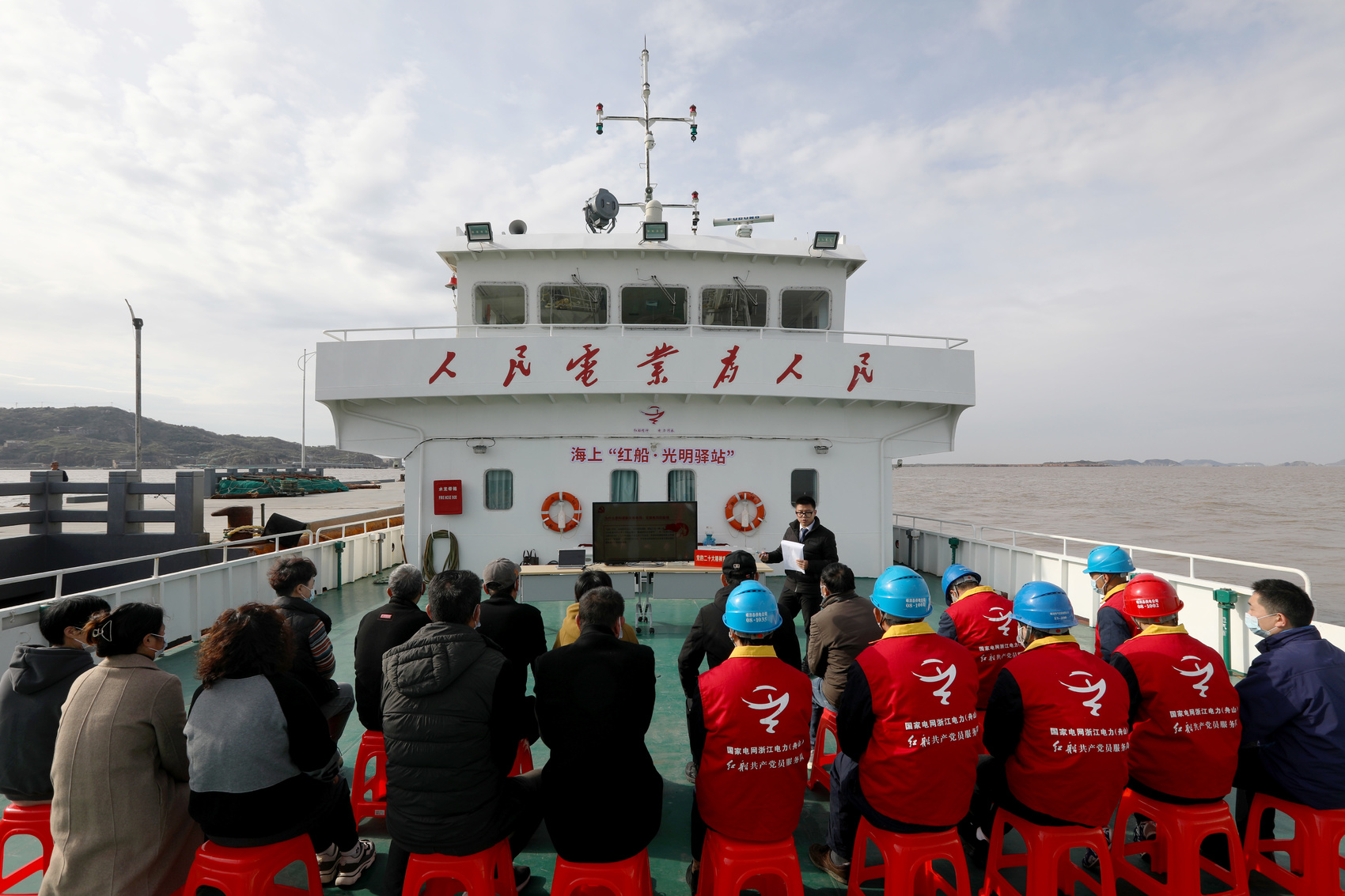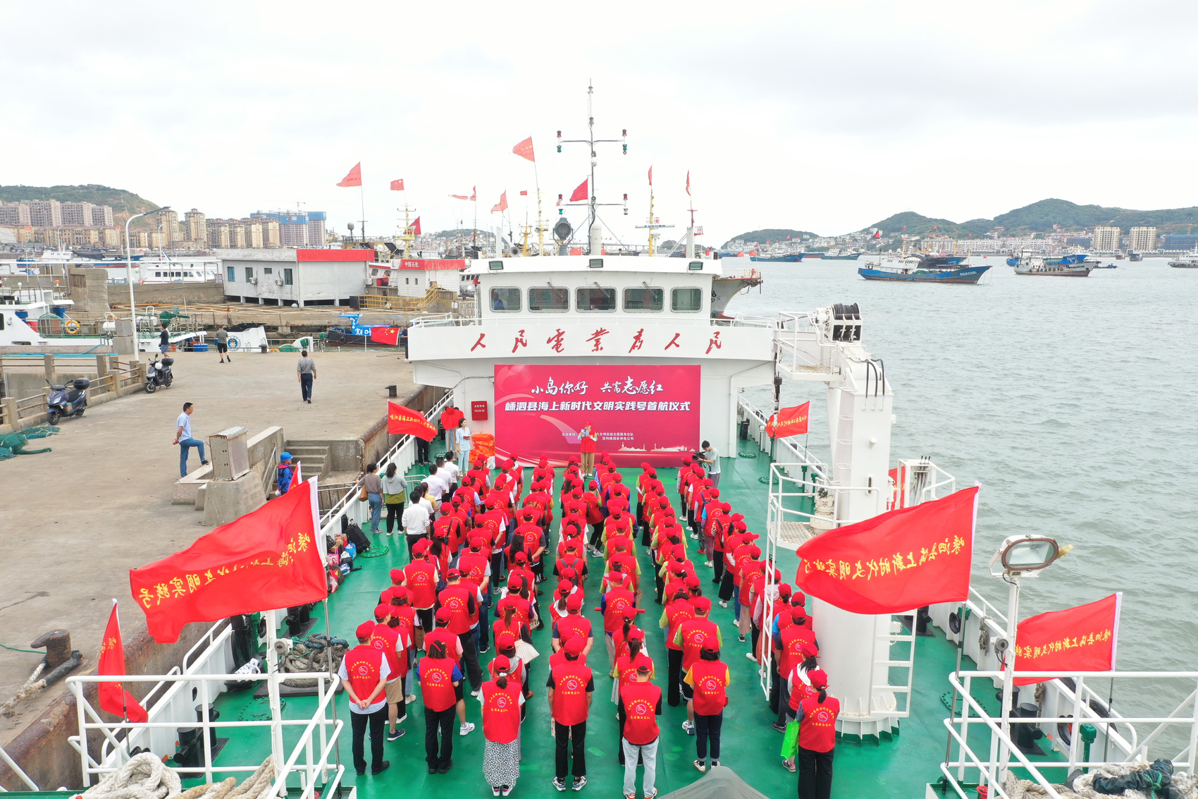浙江嵊泗县在“舟电16号”海缆船上举办“海上新时代文明实践号”首航仪式。 国网浙江电力供图