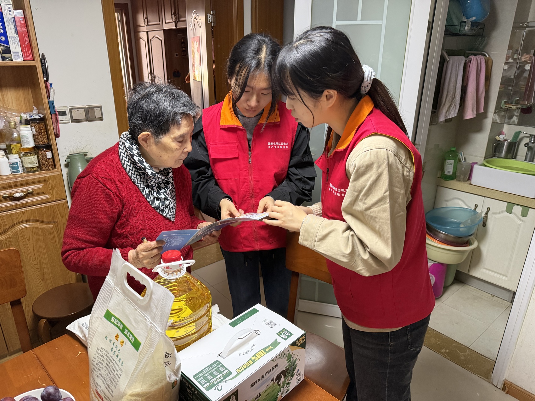 国网江苏电力(南京石城)共产党员服务队为独居老人家送上生活物资、检查用电设备。 国网江苏电力供图